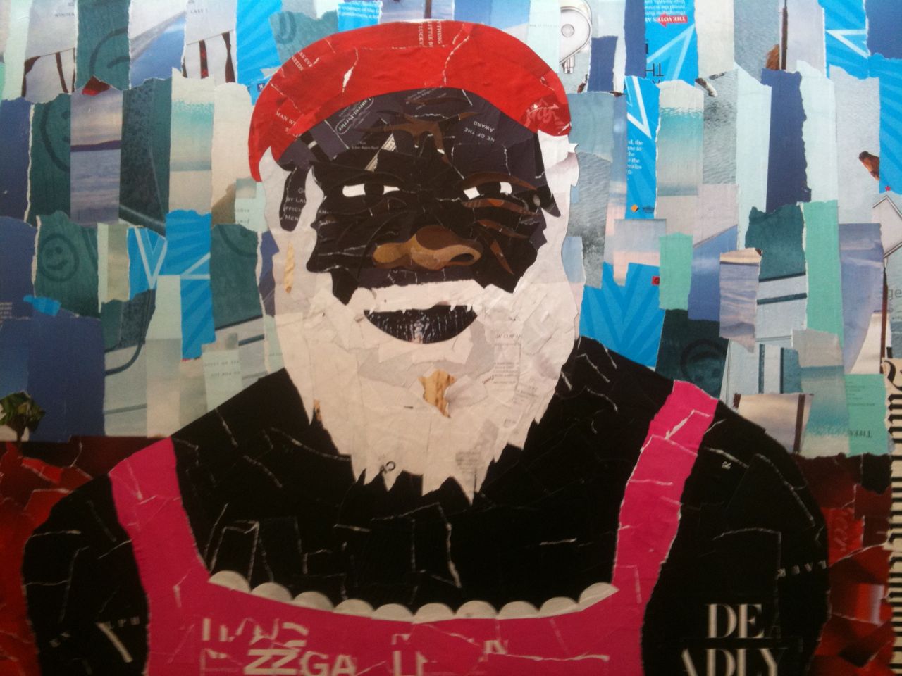 This collage is of a Anangu man in a woman’s dress; him speaking on behalf of his wife. There’s a tree of knowledge in the background to his left and a quote on the right from Luke 18:16 “Suffer little children”.