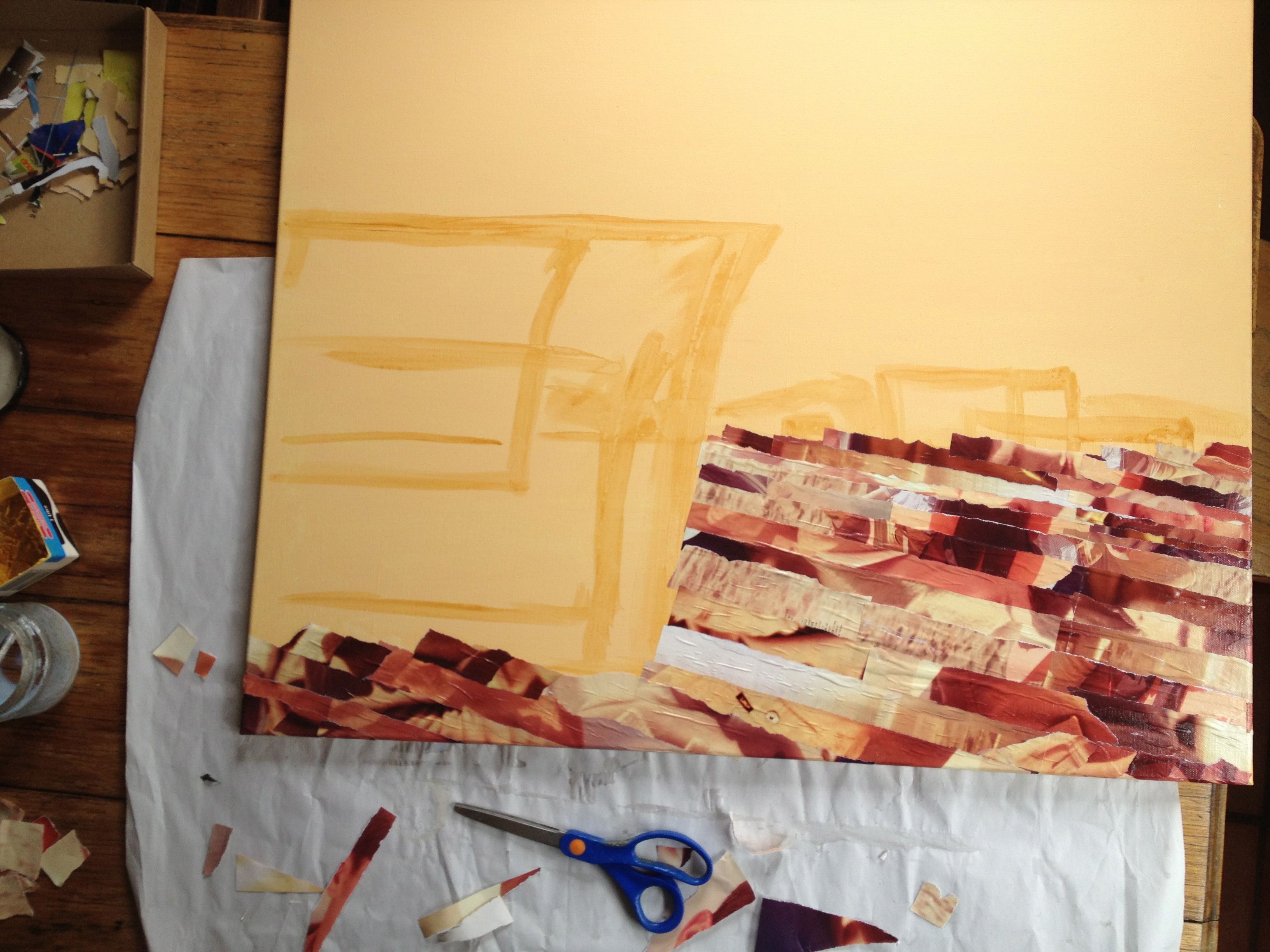 On the straw-coloured background, I lay on a field of browns and yellow hued paper, collaging the field, trying to make them look like harrows. I know it’s not working but I keep going. Then I paint the background white. Wrong again. Then I build up the hay bales, in big bricks of paper. Wrong, wrong, it looks like playschool. I’m ready to kill.