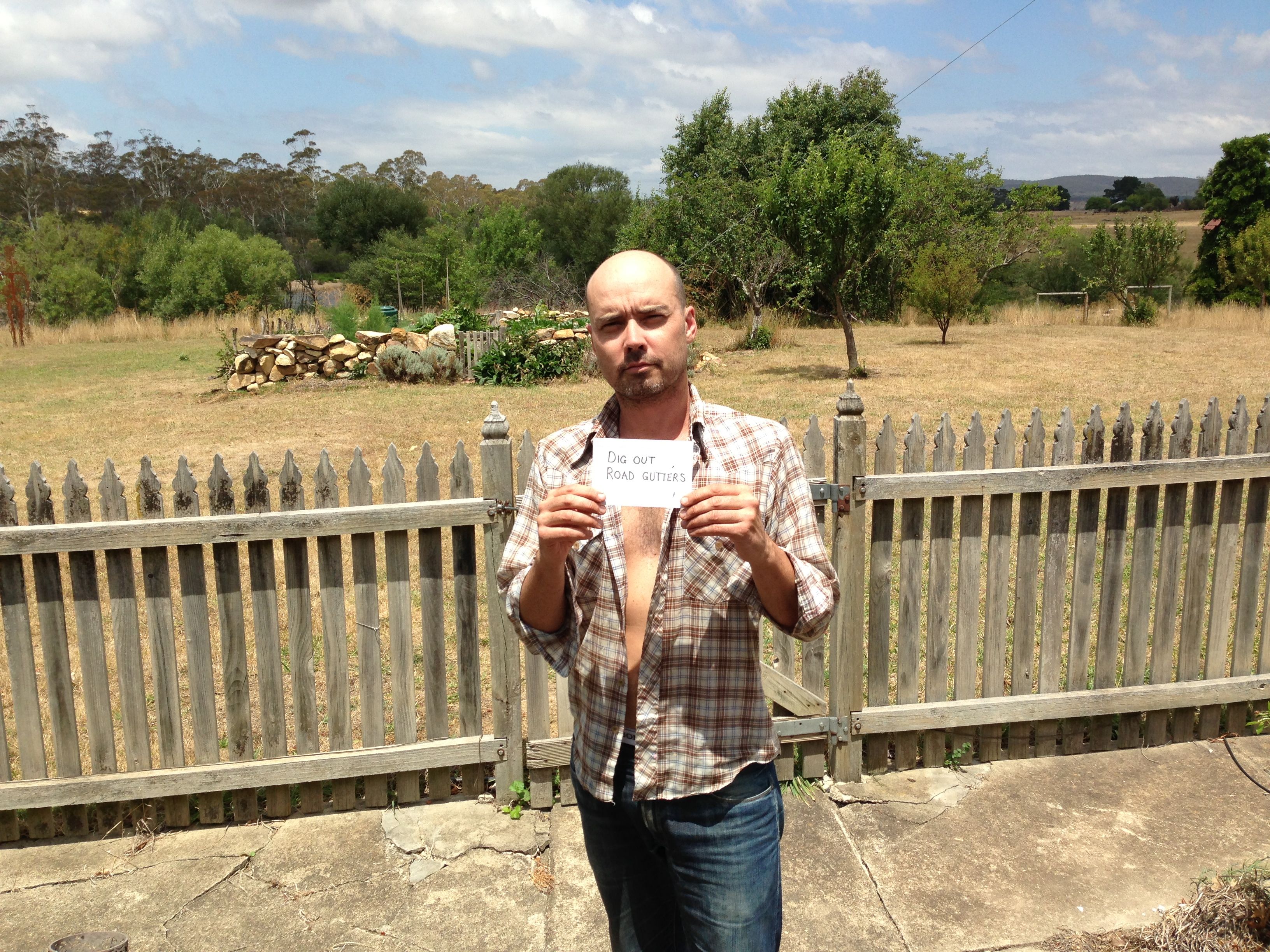 The dumb part of the idea was thinking it would be fun to photograph myself with the card and then with the job once it was done. Why anyone would think “Dig out the road gutters” and then showing a photo of a road gutter even mildly interesting is beyond me.