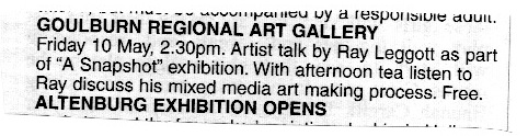 It’s nothing much to look at. A few words in a column relegated to things to do to fill in lazy Friday afternoon. But for me it was a big deal, huge. Being invited to showcase my work in Goulburn Regional Art Gallery (GRAG) as part of ‘A Snapshot’ series meant so much to me. Not only did I get to share gallery space with the likes of Ben Quilty and Dadang Christianto but I also was invited to present to a small group about my art practice, what inspires me and how I got to where I am in my art.