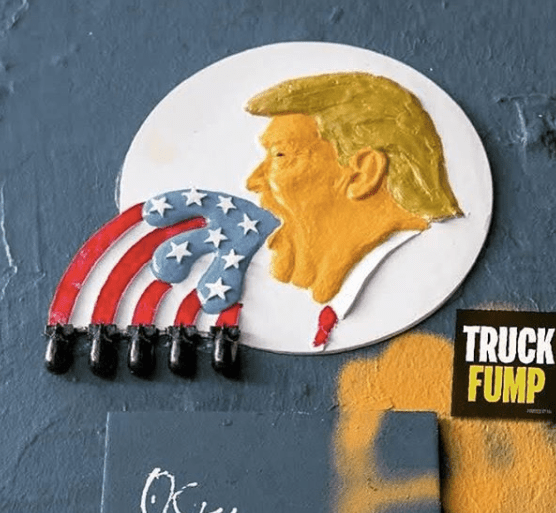 While Obama gave us hope, Trump gave us something else entirely. Antony Micallef portrays Trump as a health hazard. Hanksy turns Trump’s bulbous body into something else entirely. And Will Coles version of Trump spews destruction.