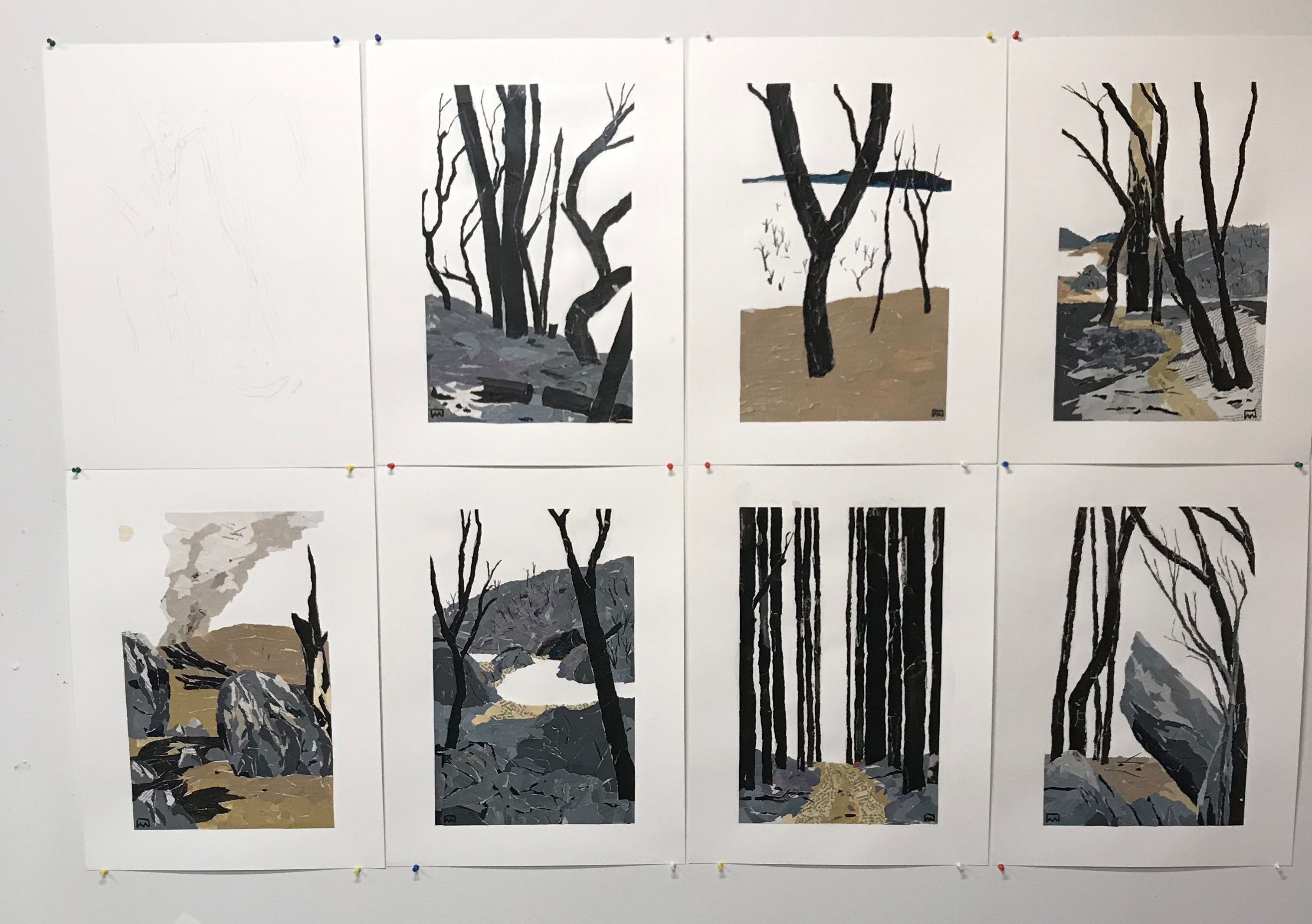 It was a real catharsis to create these works. Turning the trauma of the fires into this visercal response. It also forced me to create a new collage technique. When I couldn’t find the right blacks and greys in magazines, I overpainted magazines with acrylic glazes which created this fantastic range of charcoal blacks, which I tore of up and stuck down to create these fire ravaged landscapes.