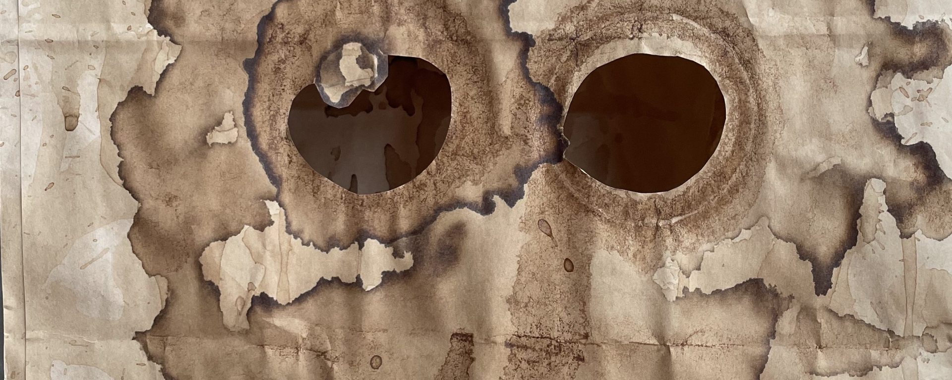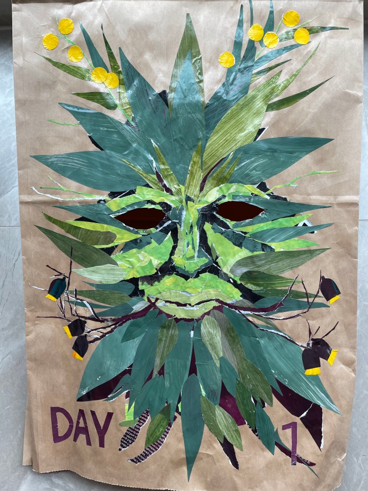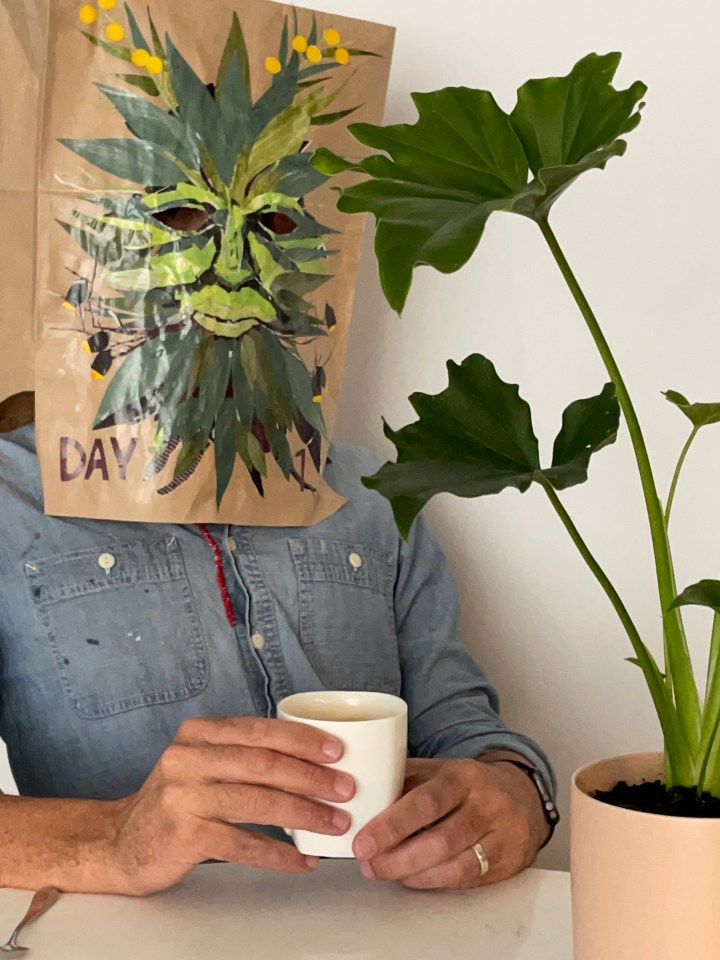 I tear up some paper I have to create a mask. A quarantine mask. The end result is frightening; a Danish, tear-streaked ghoul. Next day, one of my oldest friends from high school sends me a pot plant. I cry as I bring it into my room – and I make a green man mask to talk to the plant. Next day, another brown paper bag, another mask. And another, and another and another.