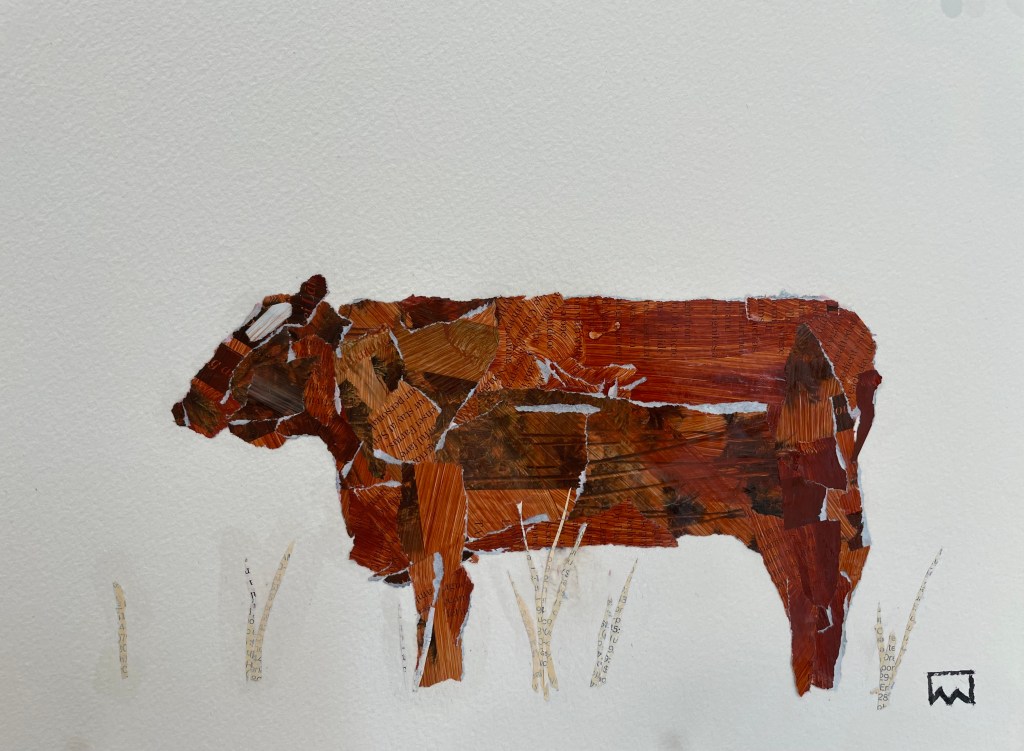 I have better control of the results this way, it feels plodding. There’s no serendipity. I start to make a cow. A simple work on paper. Laying down paper to create the shapes.