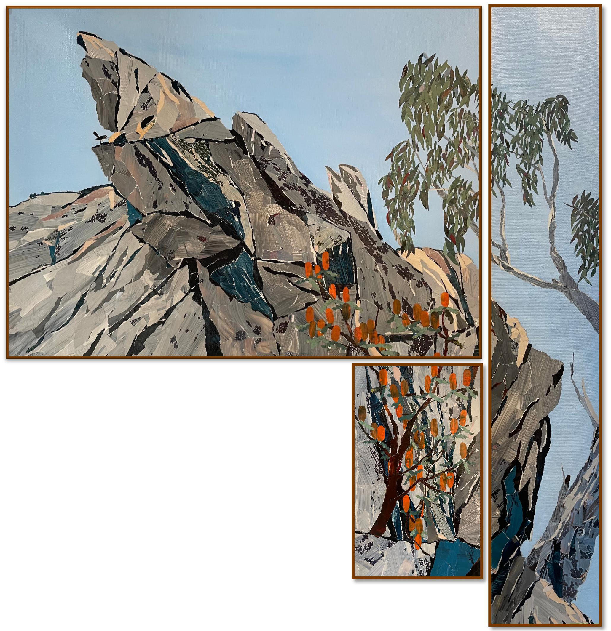 I take the three canvases off my studio wall and work on them on the table. When I put them back up, none of the elements match up where the canvases join. One tree, the banksia, is upside down.