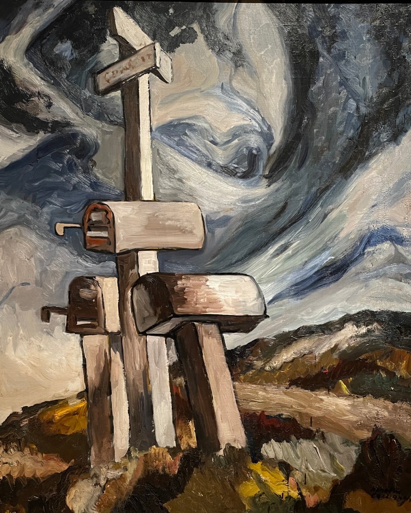 The sky is wild, swirling down towards the mailboxes. The sky is rendered with such force that it looks like the clouds are buffeting the drunk mailbox over.