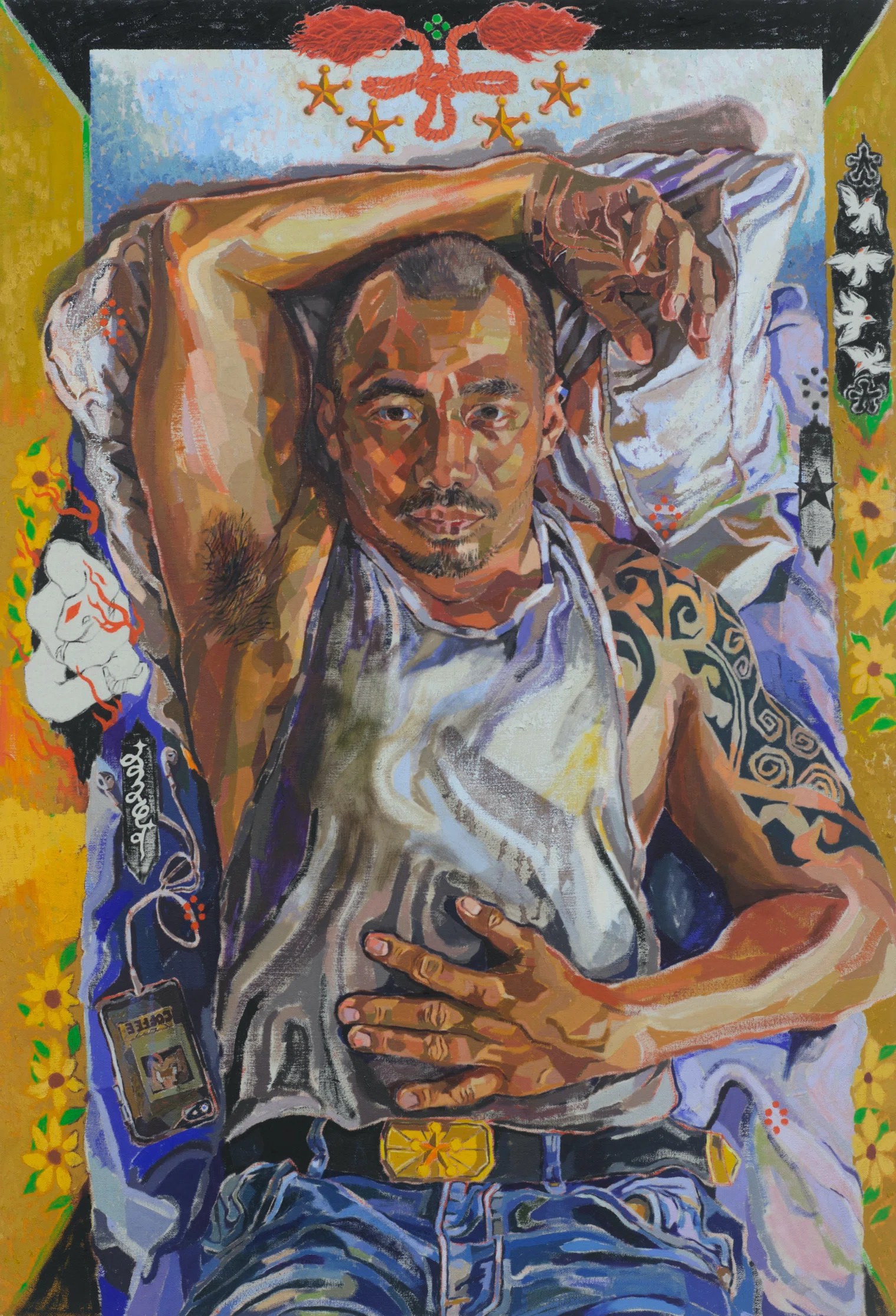 The Whitney Museum describes Toor’s work as offering intimate views into the imagined lives of young, queer Brown men residing between New York City and South Asia. Lush interior scenes depict friends dancing, playing with puppies, and gazing into their smartphones.