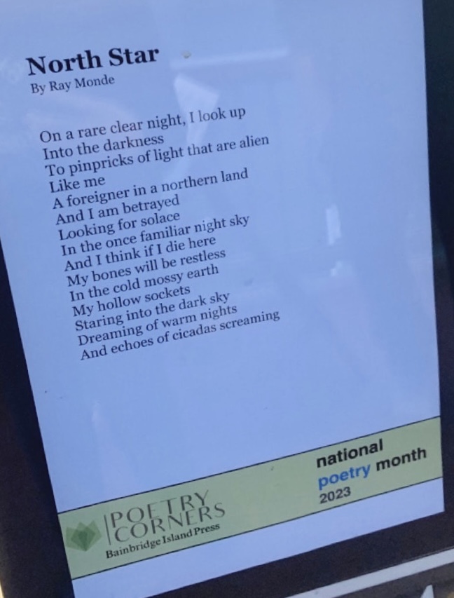 As part of National Poetry Month, a new poem by artist Ray Monde explores the dark side of the North Star. Featured in Poetry Corners and published by Bainbridge Island Press.