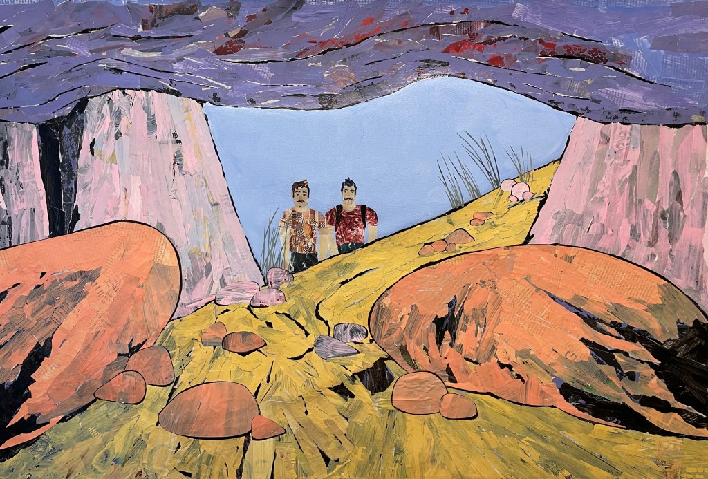 I like to think about what the figures might be saying, why they’re there, what the relationship is between them. In this series, the figures are male because fellas behave differently when they’re in the bush, out of the gaze of the wider world. They’re prepared to open up and have difficult conversations and resolve things that’s on their mind.