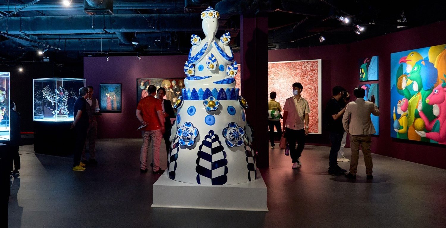 The work of Vipoo Srivilasa is instantly recognisable for it’s intricate detailing, playful characters, and vibrant blue-and-white palette. Born in Thailand and based in Australia, Srivilasa draws on his bicultural heritage to create works that explore themes of identity, belonging, and cultural exchange.